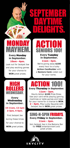 Monday MayhemEvery Monday, 10am – 4pm. Look out for Jackpot Joe and play exciting games for your chance to win great prizes. ACTION Seniors 100Every Tuesday 11am-3pm we're giving away $100 every hour to a lucky ACTION member with a Seniors Card. All day, be spotted by Jackpot Joe for your chance to win great prizes! High Rollin' WednesdaysEvery Wednesday 10-11am, 12-1pm, 2-3pm, 4-5pm. Find Jackpot Joe during these times to play 'High Rollers'. ACTION 100Every Thursday 11am-3pm hourly ACTION $100 prize draw. Use your card while using any gaming machine or table game and you will be in for a chance to win! 2-4pm Find Jackpot Joe to WIN great prizes playing lucky squares. Spin N' Win FridaysEvery Friday 10am-4pm look out for Jackpot Joe for your chance to Spin N' Win. Bonus prize for ACTION members.