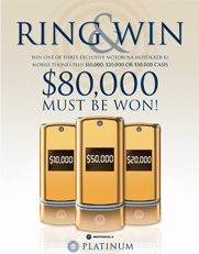 $80,000 WILL BE WON WITH ‘RING AND WIN’ Three lucky Platinum members will dial to win $10,000, $20,000 or $50,000 in cash, and be the first in New Zealand to own a special edition Motorola MOTOKRZR K1 phone. HOW TO ENTER RING AND WIN You will receive one entry ticket for every 2,000 Action points you earn on gaming machines on Sundays, Mondays and Tuesdays from 2nd September to 25th September. Simply collect your entries from a VIP Host at the end of the promotion and place them in the Platinum Room barrel. DRAW NIGHT WILL BE SOMETHING SPECIAL Join us in the Platinum Room for complimentary champagne and canapés on Sunday 30th September. The prize draws start from 8pm and you’ll need to be present to be eligible to win. It will be a night to remember as you may be the one to make a phone call you’ll never forget. Come 'watch the game with the players'!!